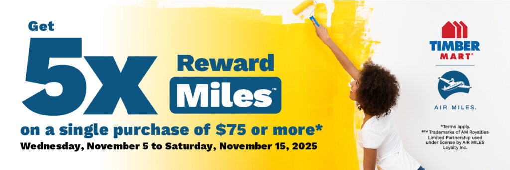 Offer valid November 5 to 15, 2025. Valid only at participating TIMBER MART locations. Minimum $75 purchase must be spent in a single transaction, excluding taxes, gift cards, delivery charges, and wholesale and house accounts. The “5x the Miles” multiplier offer applies to the standard base Mile earn rate at TIMBER MART of 1 Reward Mile for every $15 spent (subject to the terms and exclusions of the base offer as outlined at https://www.airmiles.ca/en/offers/partners/timber-mart.html). No coupon required. Limit of 1000 Reward Miles per Collector Account per Promotion period. AIR MILES card must be presented at the time of purchase. Offer cannot be combined with any other AIR MILES offer or AIR MILES promotion. This offer is not cumulative. Multiplier Miles will not appear on your receipt. Other exclusions may apply. Please allow up to 60 days for the multiplier Miles to be posted to your collector account.